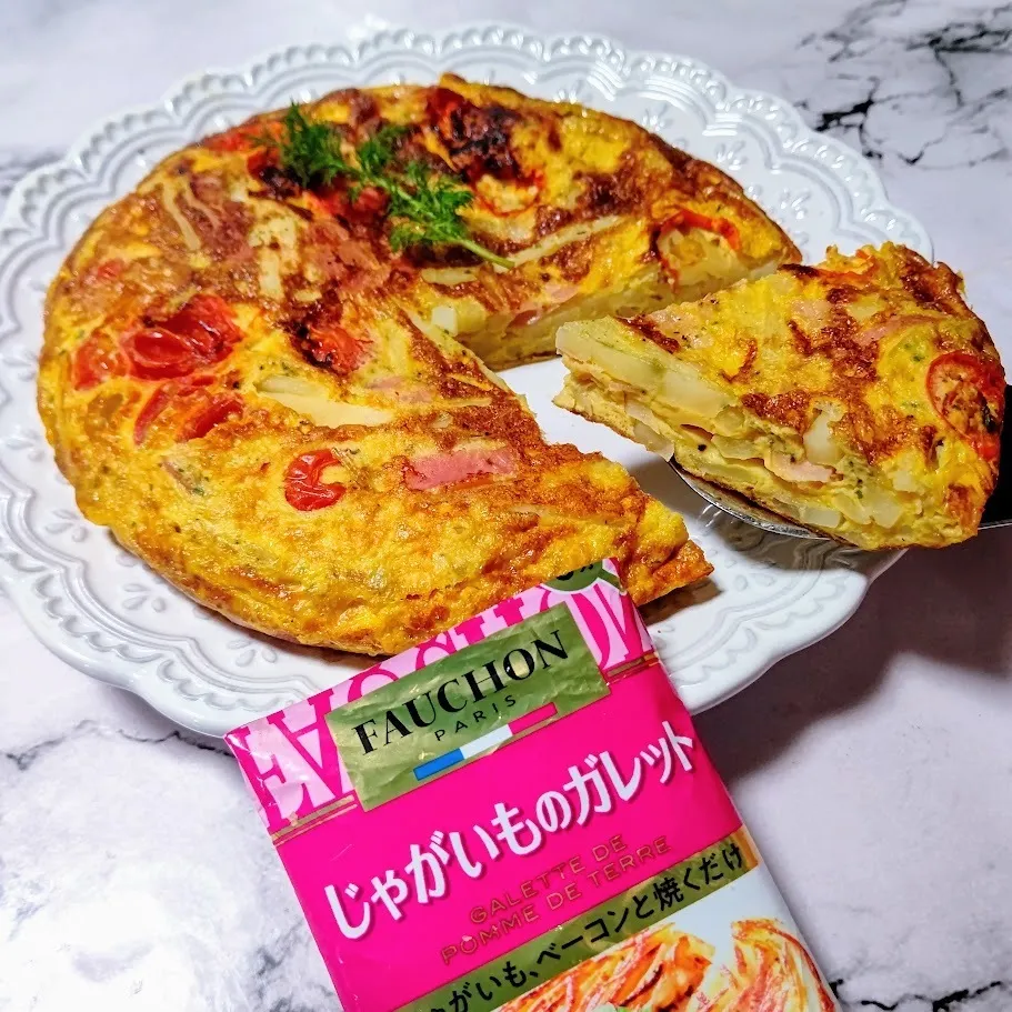 「FAUCHON フォションシーズニング じゃがいものガレット」があったので、じゃがいも3個、ハーフベーコン1袋に卵を混ぜてスペイン風オムレツを作りました。