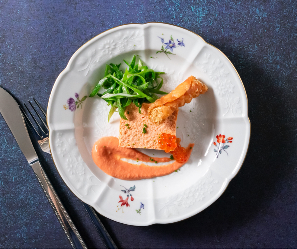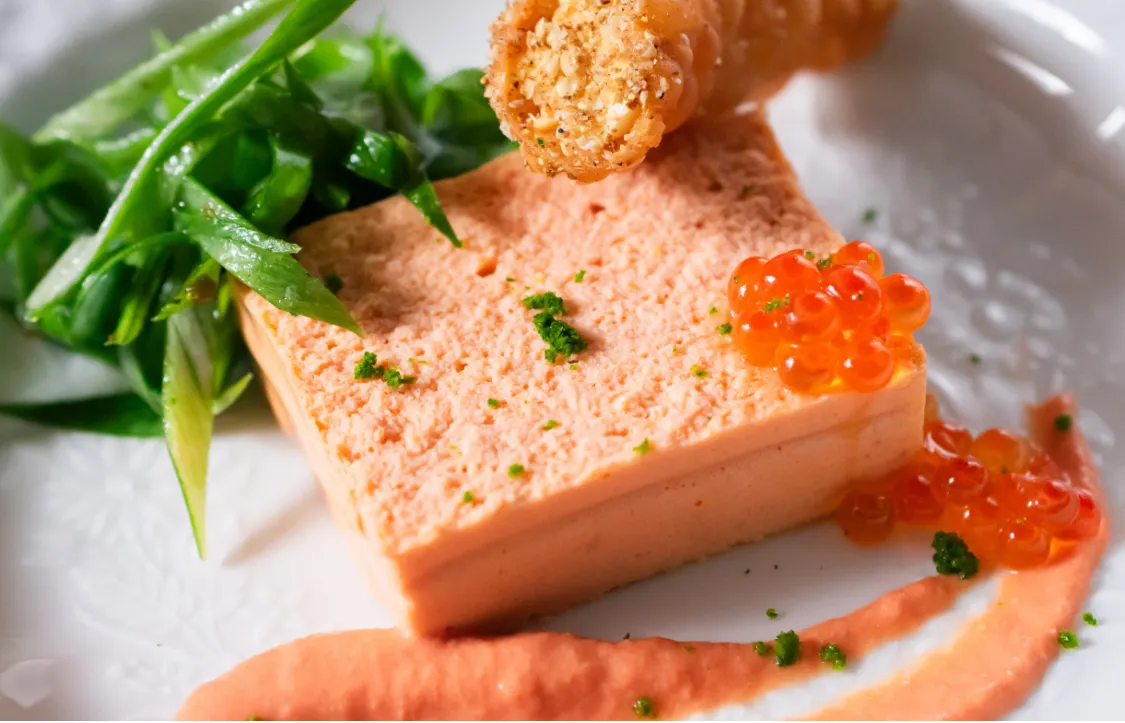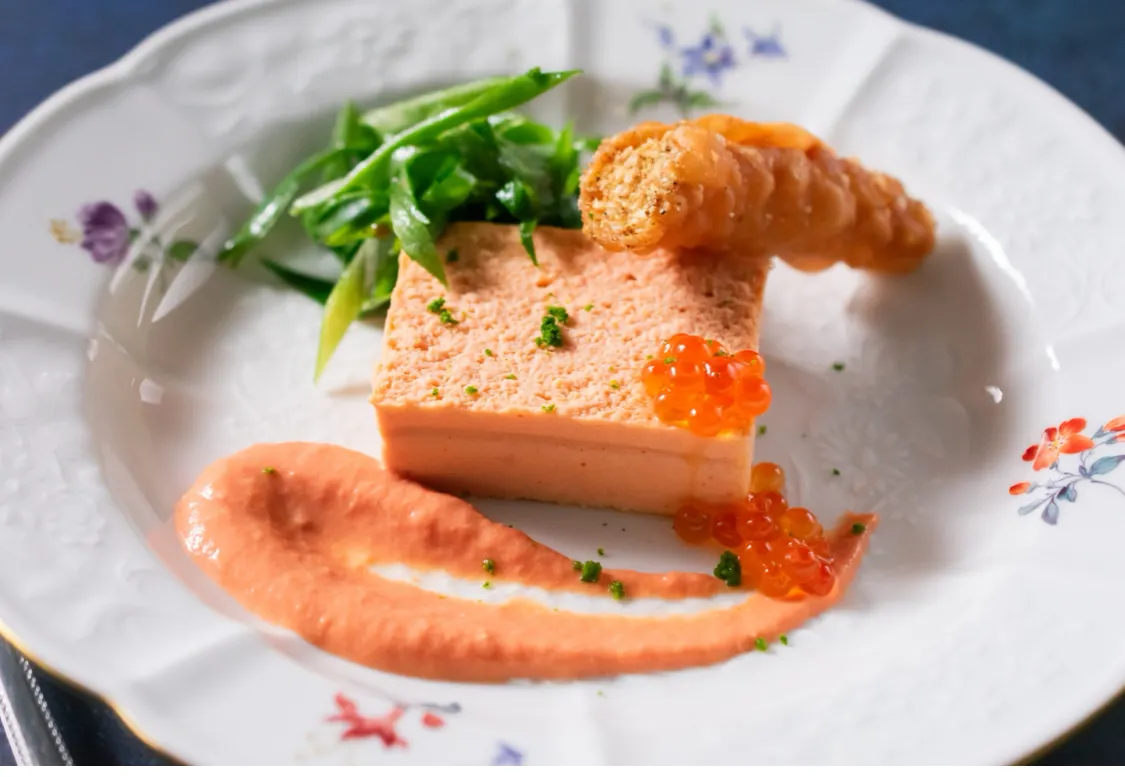 サーモンのテリーヌ 青ネギの和ハーブマリネ 柚子胡椒風味のクリームチーズ入りカンノーリ 柚子胡椒オイル漬けいくら 白味噌と柚子のロゼソース