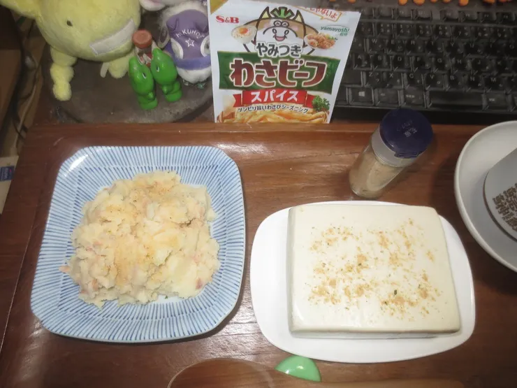 “やみつき!わさビーフスパイス”de水切絹豆腐&ツナポテサラ