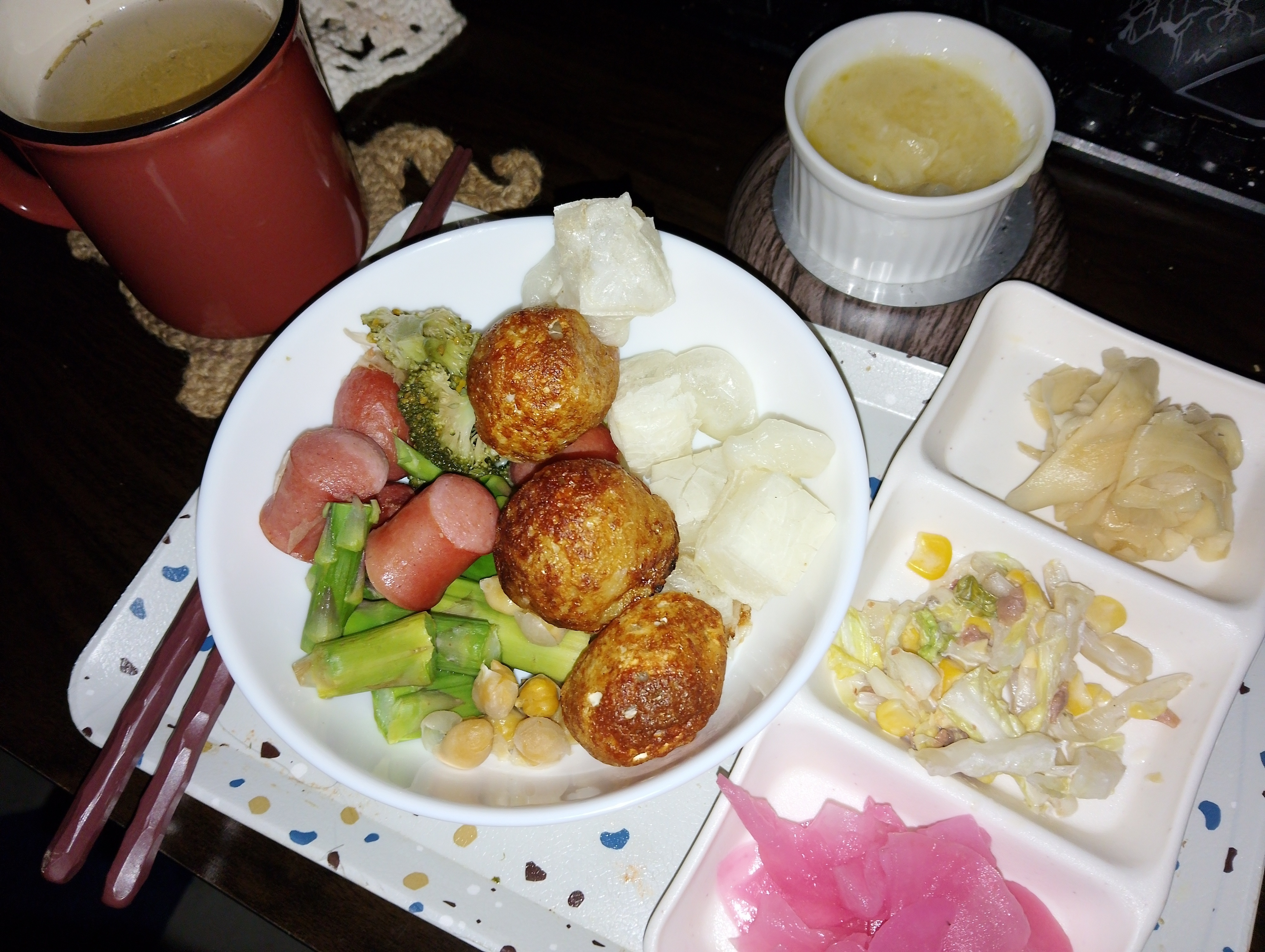 具材はお餅、たこ焼き、ブロッコリー、アスパラ、ウインナー。