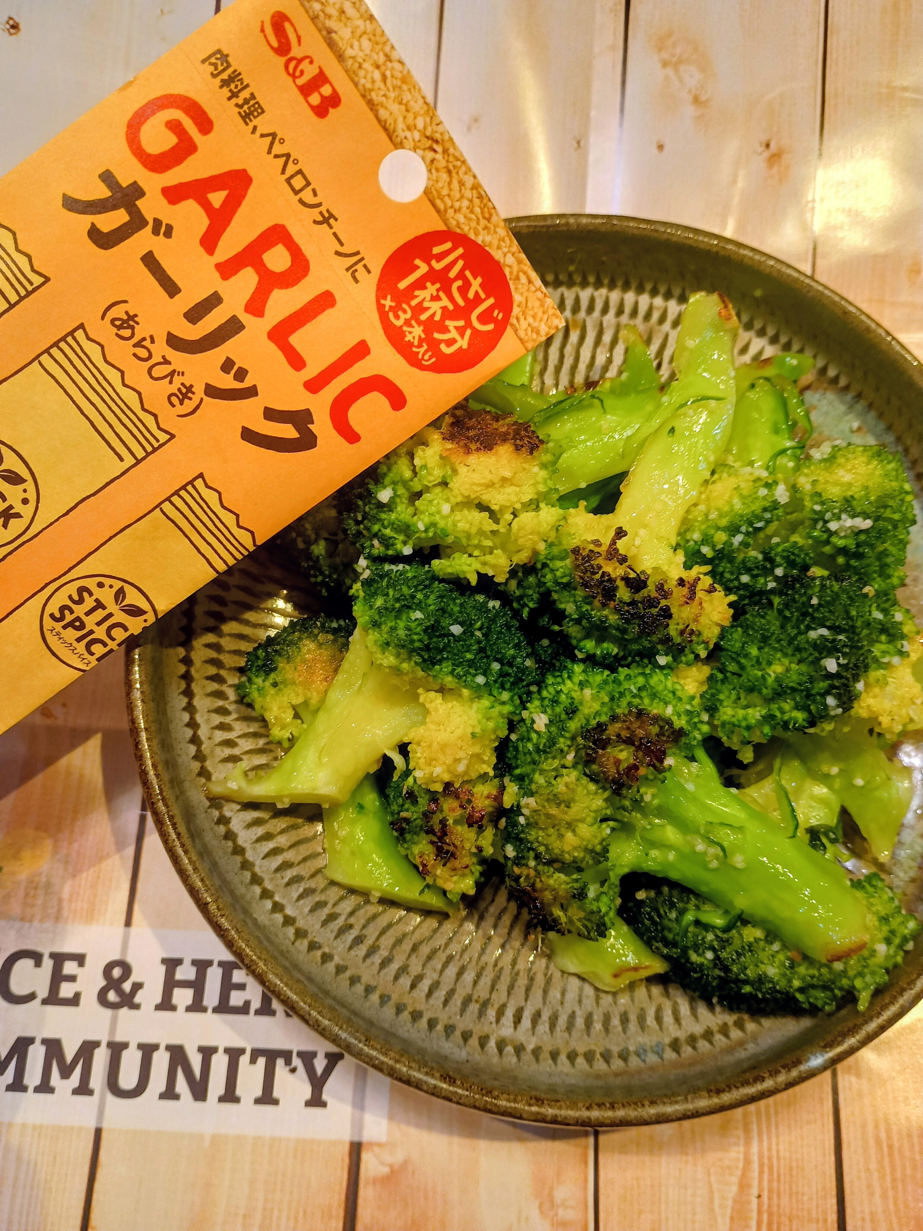 フライパンにオリーブオイルを入れて、ブロッコリーを置く。その上にスティックスパイスガーリックを小さじ1、塩をパラパラとかけ、全体に混ざるようにする。火を付けて弱火で10分炒める。