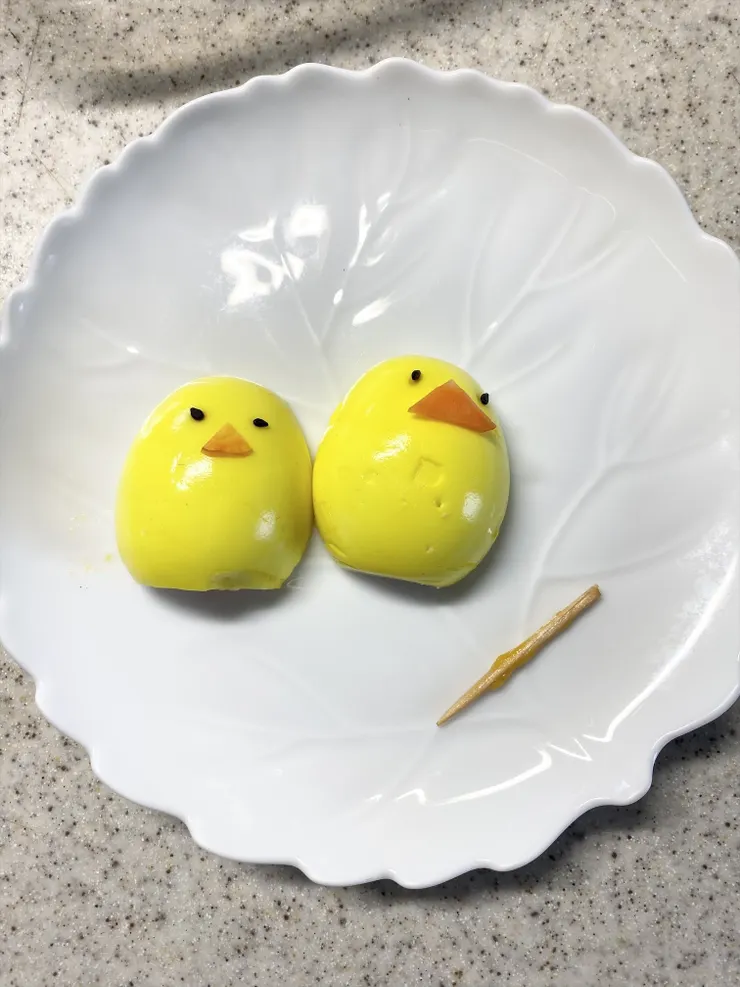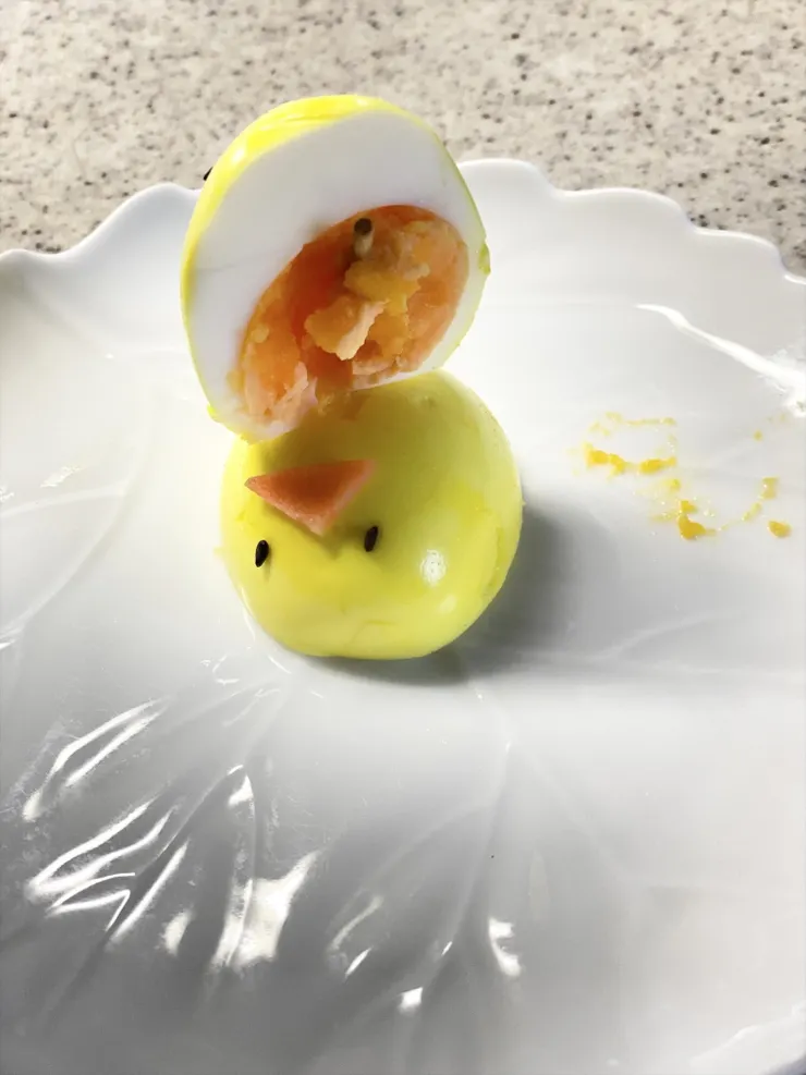 ターメリックたまごを縦に半分に切って2人とも顔を付ける。