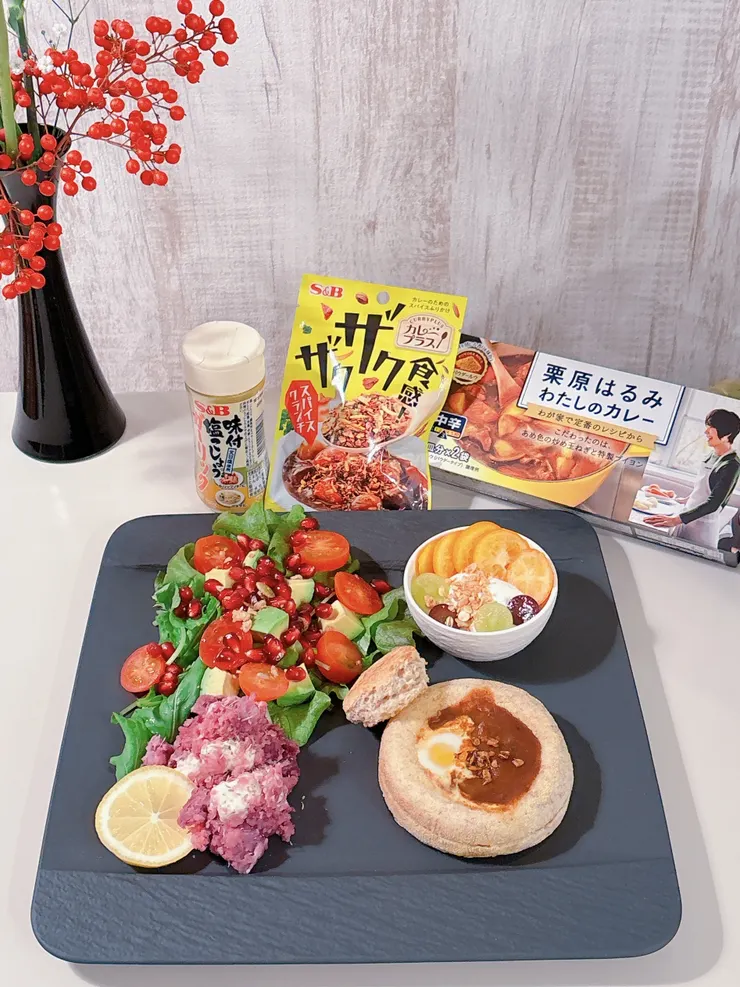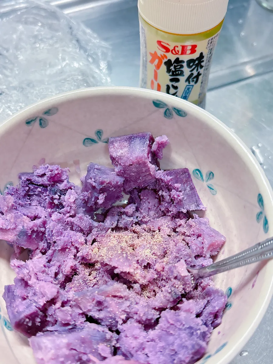 「エスビー味付塩こしょう」は、左手前の紫サツマイモのサラダに使いました