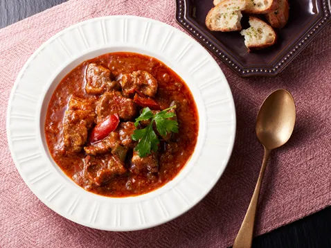 パプリカは加熱調理で甘さのある風味が引き出されます。このため、煮込み料理では特に、色だけではなくその風味が重要な役割を果たします。
