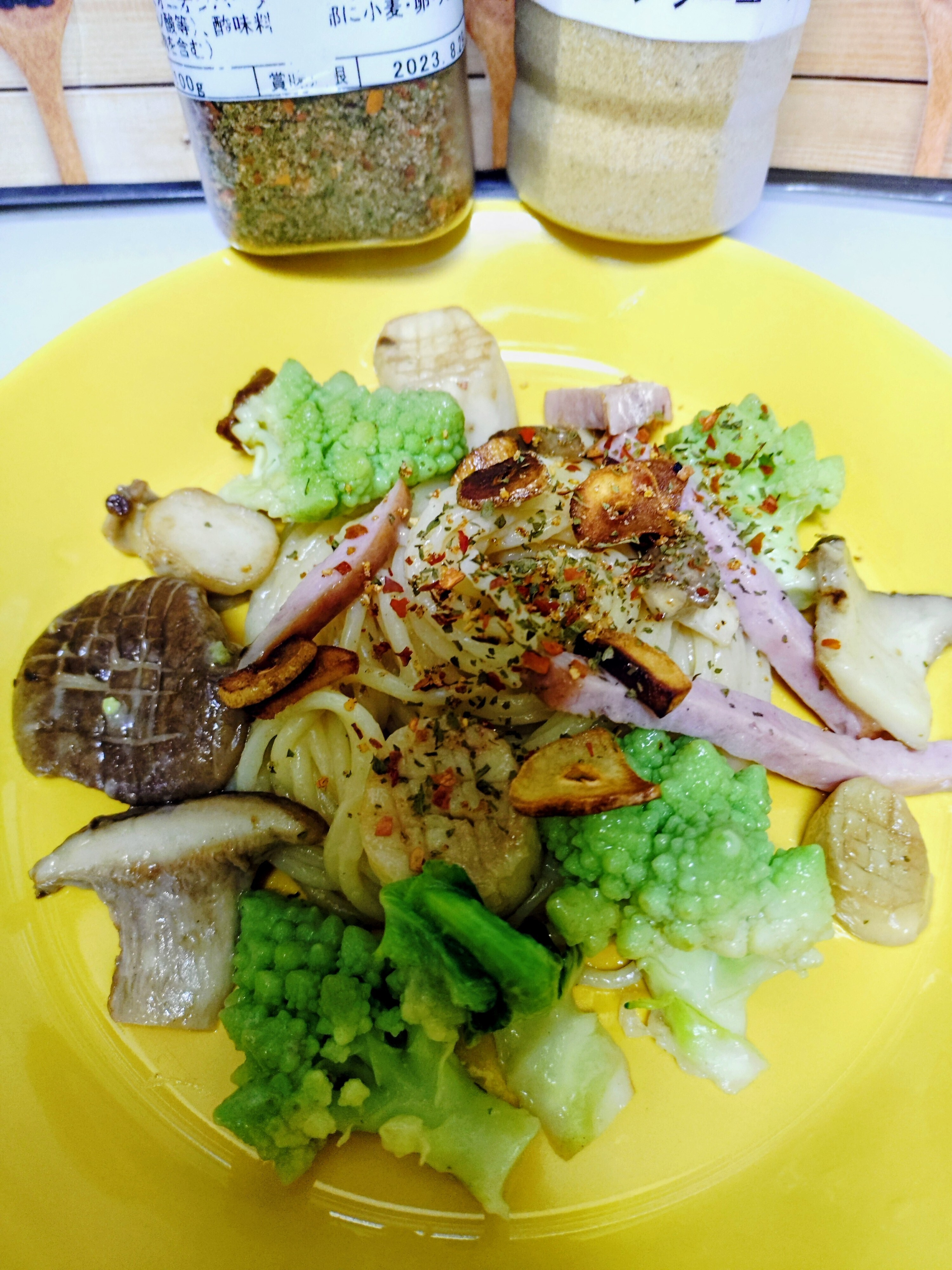 💠ロマネスコ、エリンギ、ハムのペペロンチーノスパゲッティ