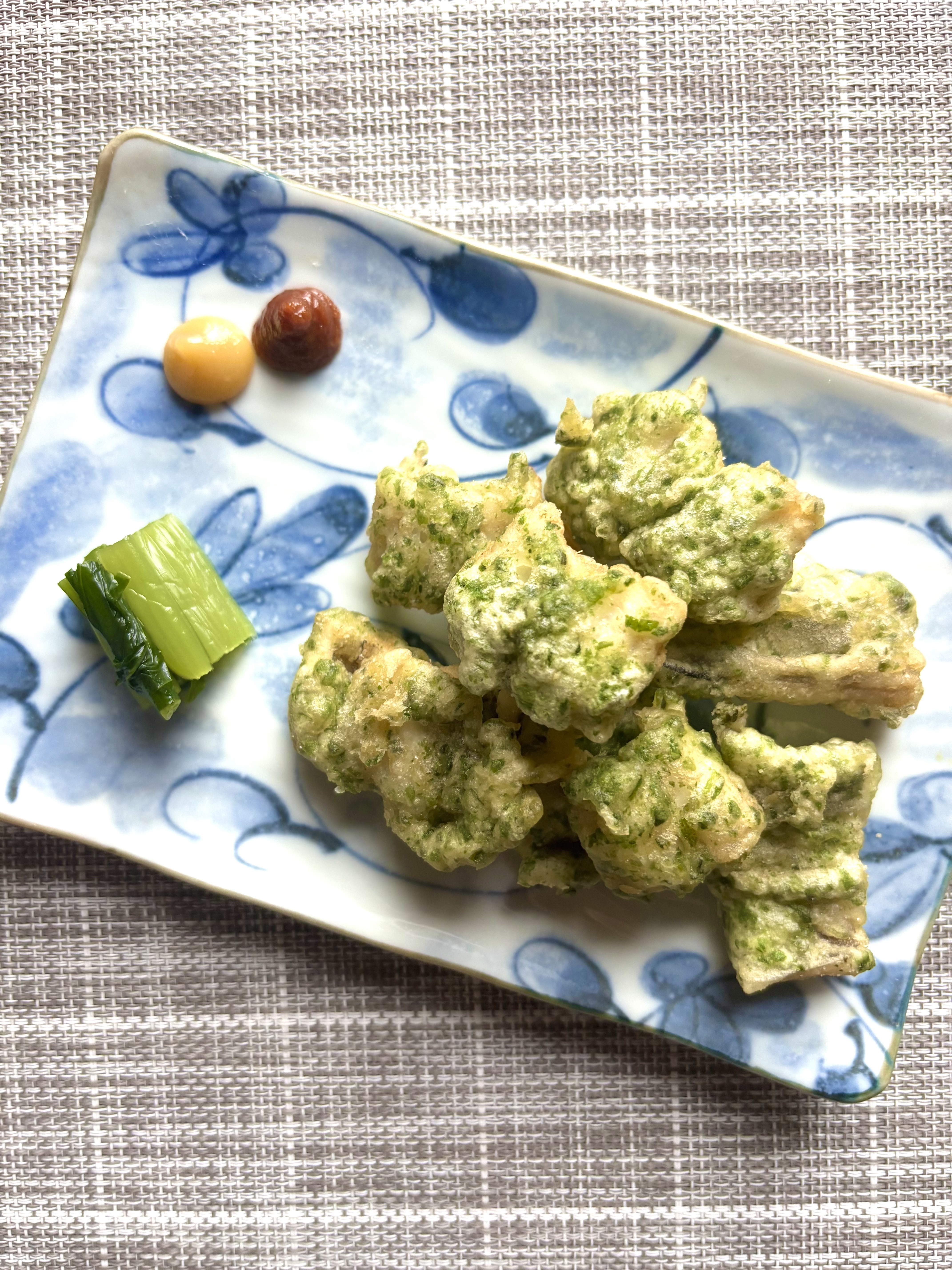 穴子半分くらいを一口サイズに切る。小麦粉を水で溶き、セロリの葉のみじん切りとコリアンダーシードを混ぜ合わせる。穴子に衣を付け、天ぷらにして油を切りながら熱いうちに塩をふる。辛味噌とゆず味噌を添えて盛り付ける。セロリの葉とコリアンダーシードの香りのバランスの良い天ぷらに辛味噌とゆず味噌のアクセント!