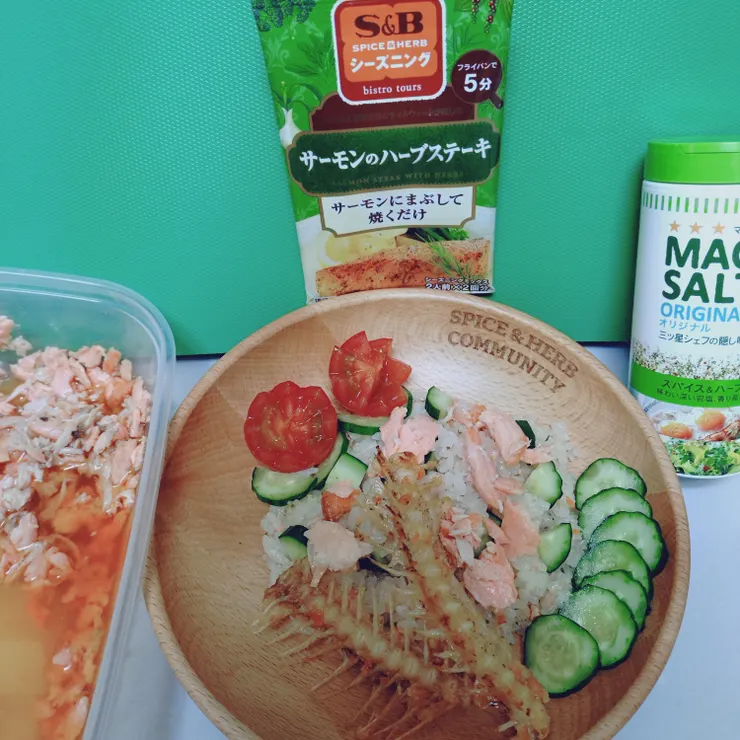 サーモンのアラから出た脂とほぐした身がとっても美味しく、SBサーモンのハーブステーキシーズニングの味付けがめちゃくちゃ良い香りでした~🎶