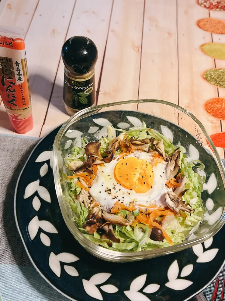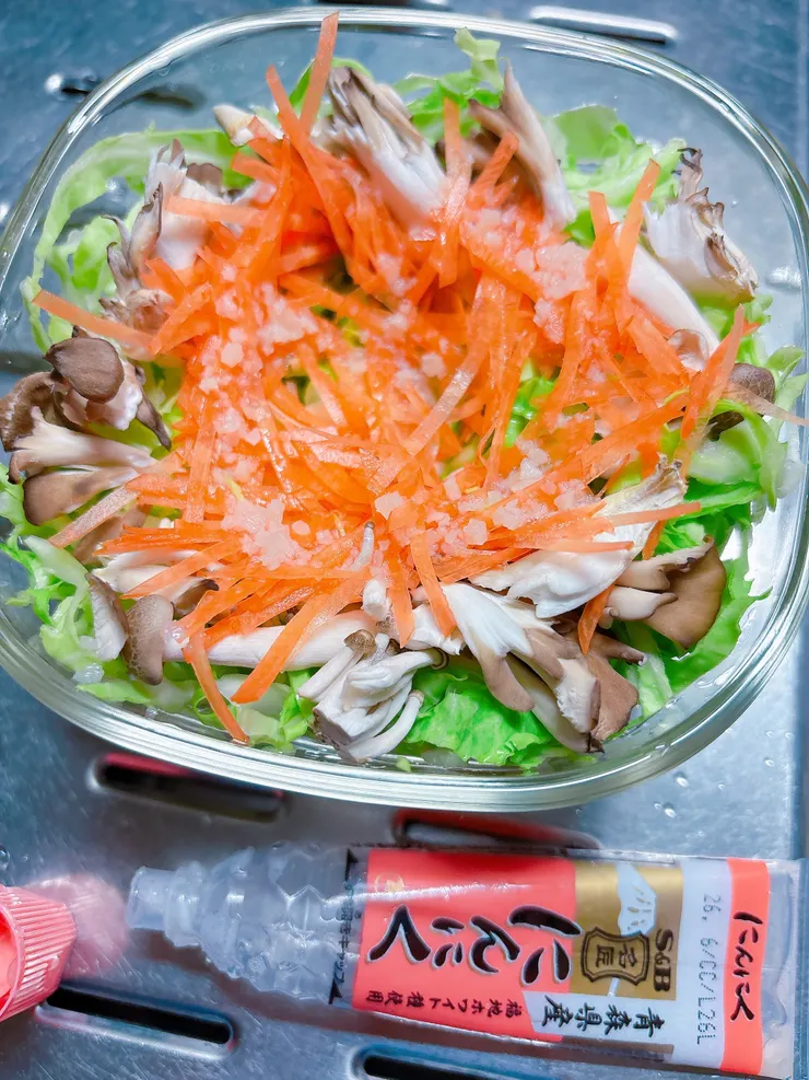 巣篭もりキャベツには、「チューブ調味料にんにく」とマヨネーズとアンチョビペーストと帆立だしをかけて電子レンジ加熱。