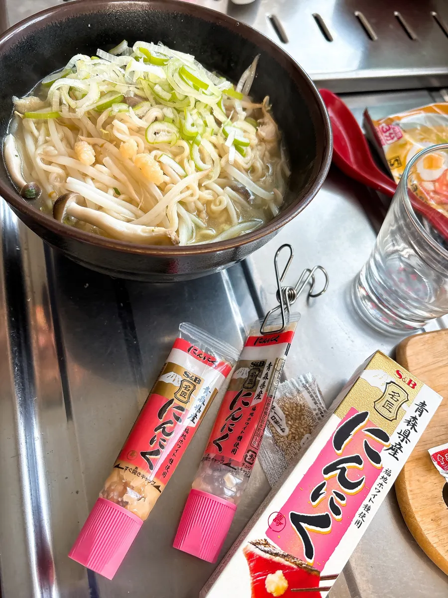 このニンニクチューブ、朝の鶏塩ラーメンで使って残りわずかな中身に水入れてシャカシャカ🪇させた使い切り♪♪