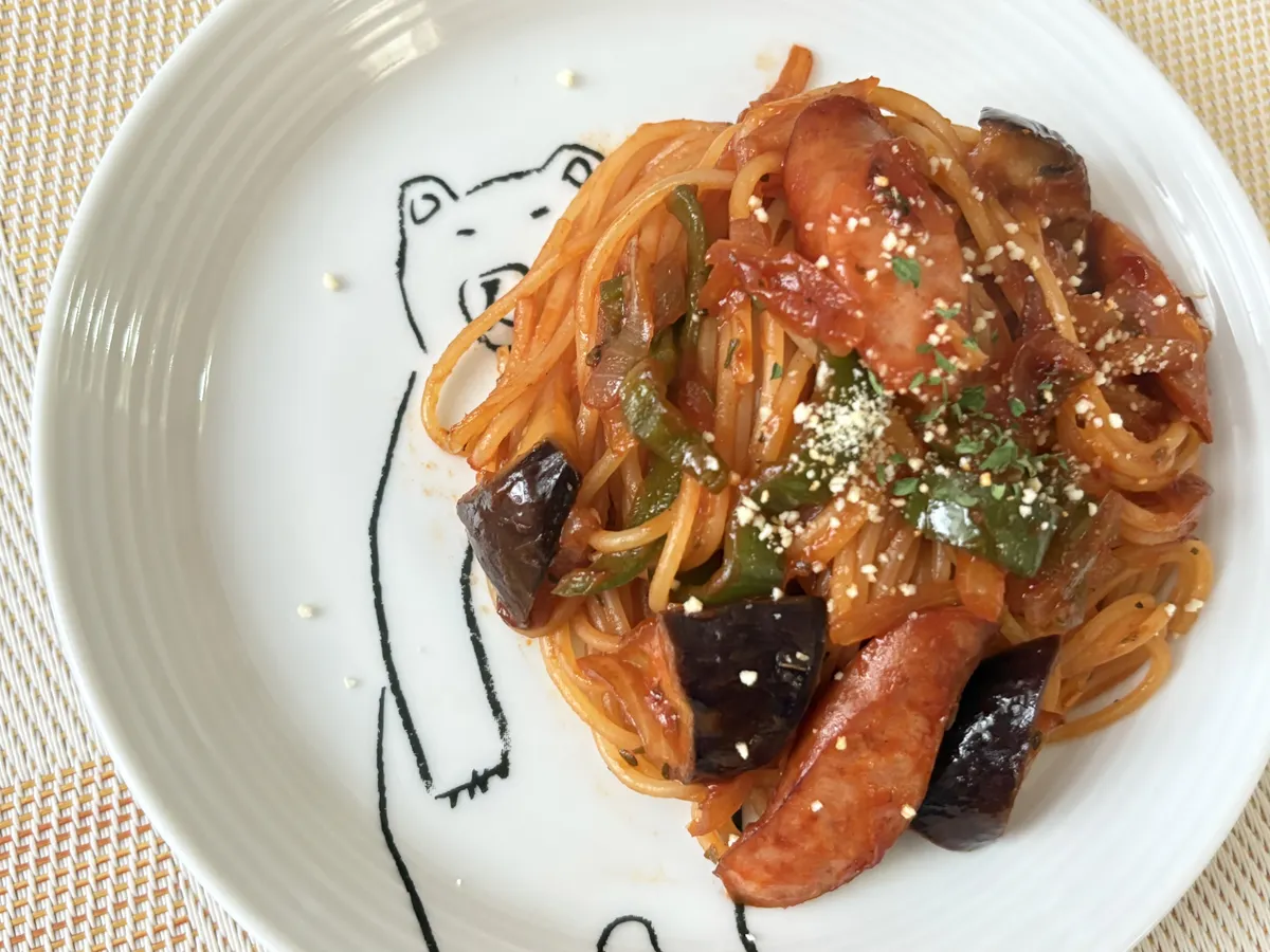 冷蔵庫の残り野菜(ナス、ピーマン、玉ねぎ)を使ってナポリタンを作ってみました。