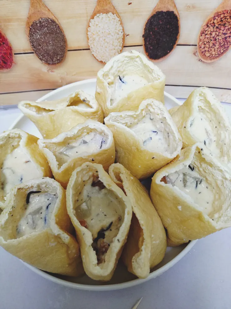 油揚げは豆腐を油で揚げてあるので、その中に野菜を混ぜた豆腐を詰めればがんもどき❓️