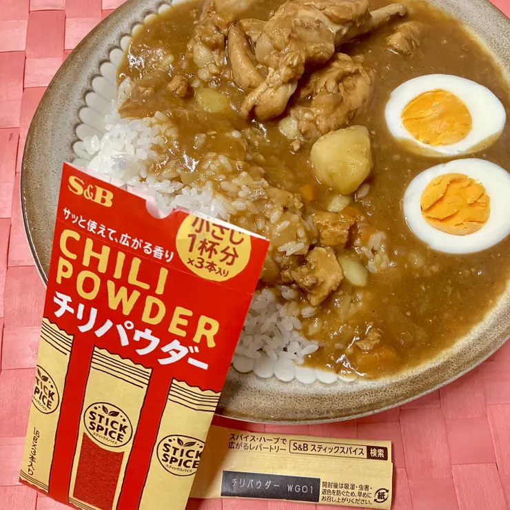 我が家は辛い系好きなので、仕上げにスティックスパイスのチリパウダーを使い、程よく辛くて美味しいカレーに仕上げました😋