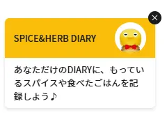 左下に出てくるポップアップ「SPICE&HERB DIARY」では、「もっているスパイスやハーブ、エスビー食品の商品の情報」や「毎日の食事日記」を記録したり「レシピ診断」をすることができます。
