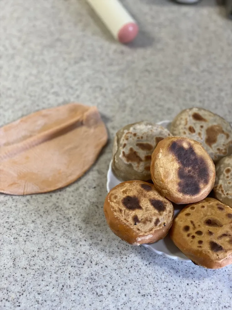 100均の綿棒、もしくはラップの芯捨てる前の硬いやつで丸く伸ばし直径13㎝くらいにする。「おやき」にする時はなんでもいいのでおかずを包む。だいたい25gくらい入る。