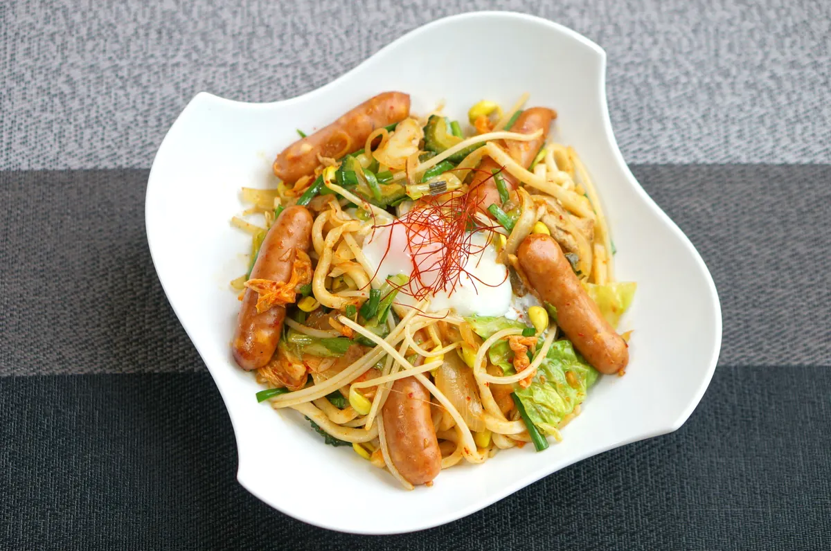投稿を表示チーズ入りウインナーと温泉卵でいただくキムチ入り焼きうどんおいしそうです