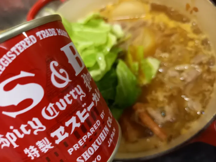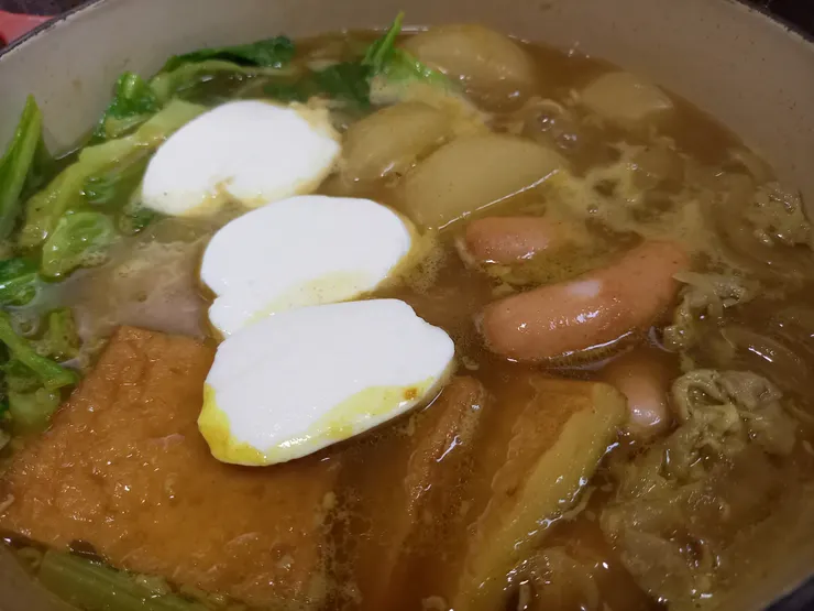 その翌日、大根丸々一本を煮物にし、半分はリメイクに使いました。そこで、カレー鍋を思いつきました。煮物は大根と天ぷらと大根の葉茎でしたが、キャベツやカボチャ、ウインナーと、ガーリック増し増しの残ってた豚肉玉ねぎを足して、カレー粉を大さじ2足しました!コンソメなど使わなくてもとっても美味しい出汁の効いたカレー鍋ができました🎵これは本当に美味でした‼️
