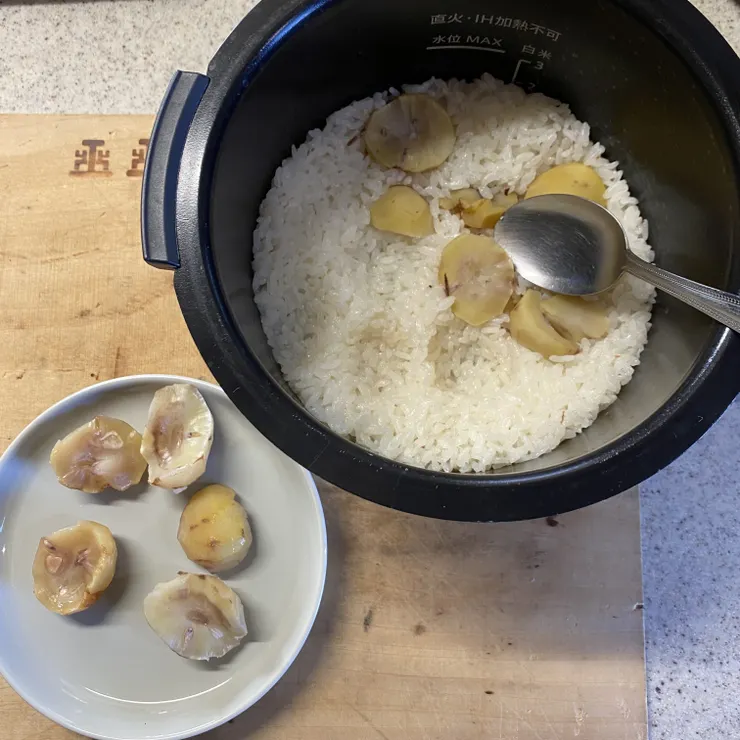 ‼️炊き上がりに🌰を取り出す。そのまま混ぜると🌰が割れます。