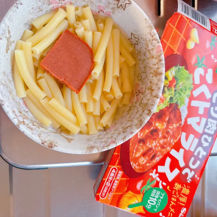 ・お水と「こくトマライスソース」1かけらを入れて2分加熱