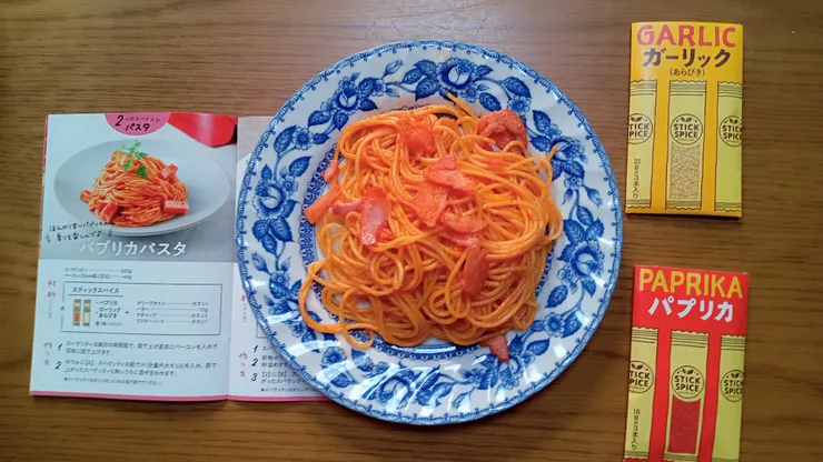 S&B様より頂いたスティックスパイスを使って、スティックスパイス Colorful Recipe Book のレシピのうち、パプリカパスタ を作りました。