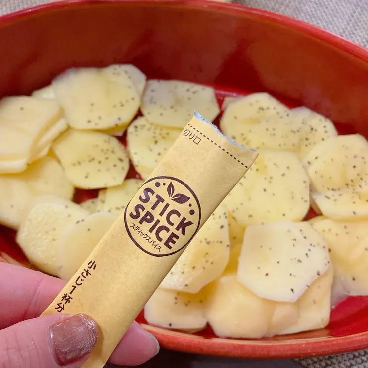 - 耐熱容器にじゃがいもを半量並べ、スティックスパイス ブラックペッパー1袋分の半量くらいを全体にふりかける。残りのじゃがいもをその上に並べて、残りのブラックペッパーをふりかける。
