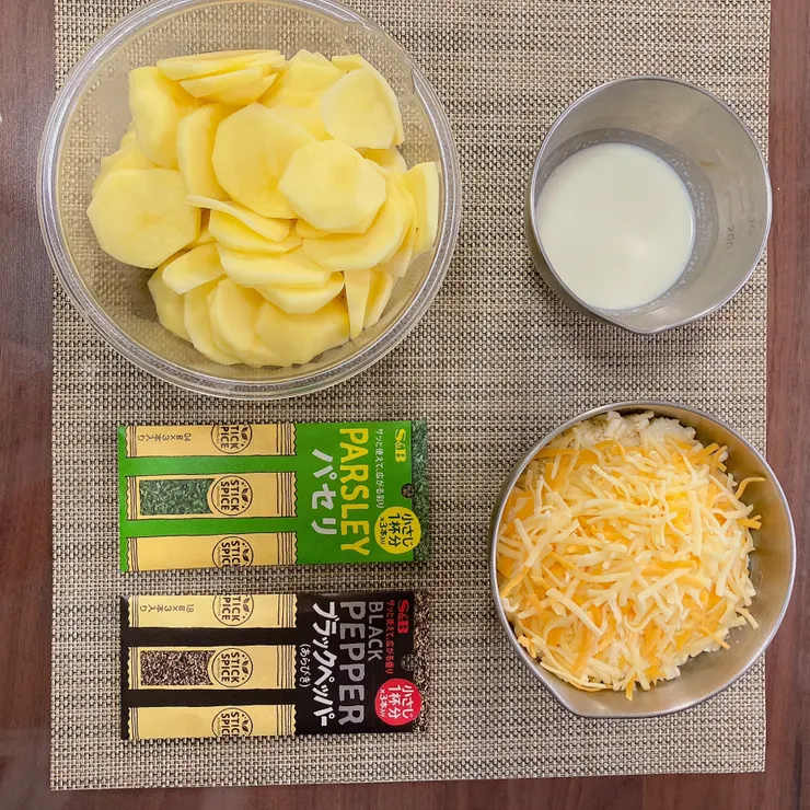 - 耐熱容器にじゃがいもを半量並べ、スティックスパイス ブラックペッパー1袋分の半量くらいを全体にふりかける。残りのじゃがいもをその上に並べて、残りのブラックペッパーをふりかける。
