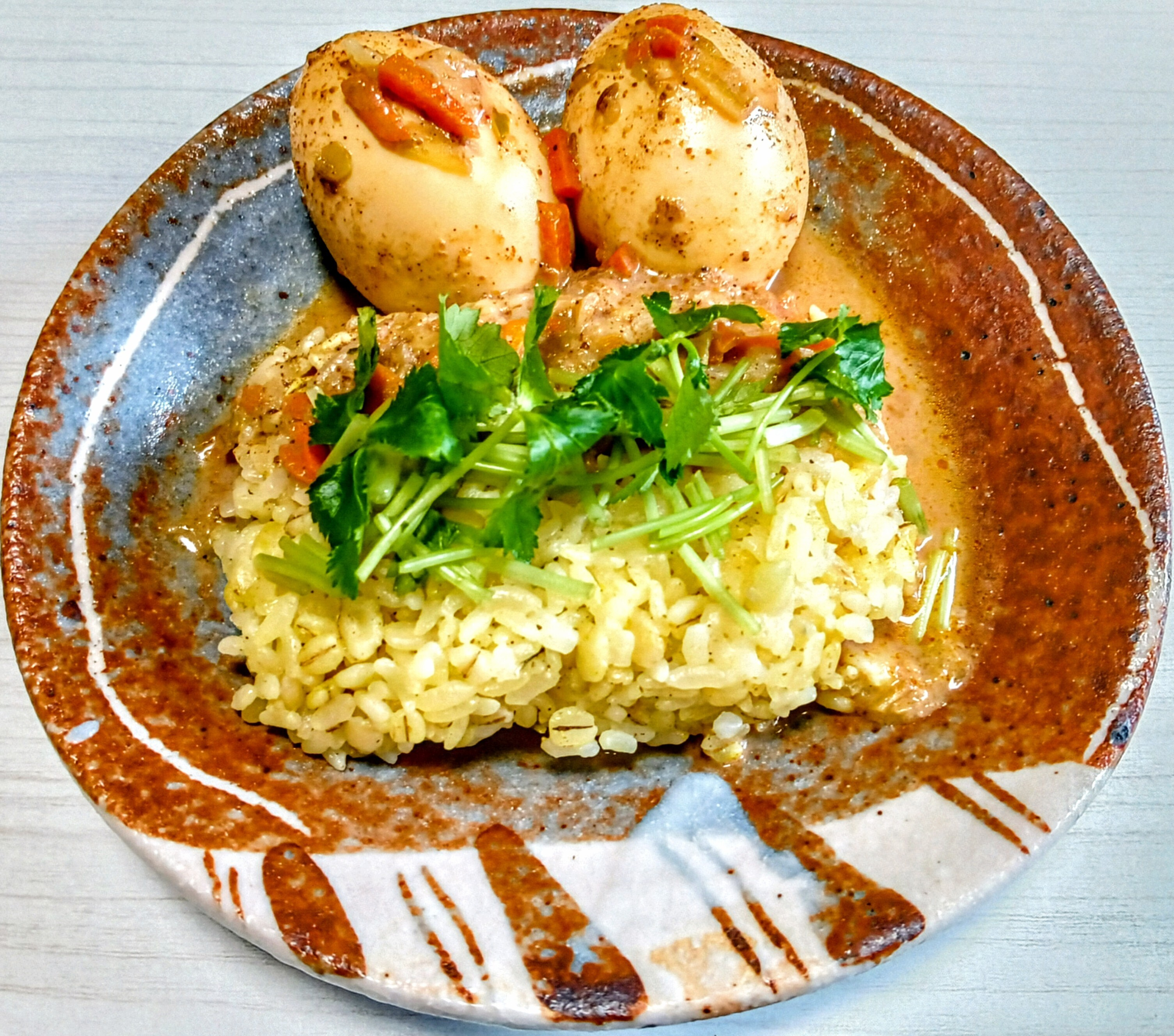 カレーをライスで茹で卵、2個を見た時巨大な鋏の蟹🦀⁉️に見えちゃって〰️😅