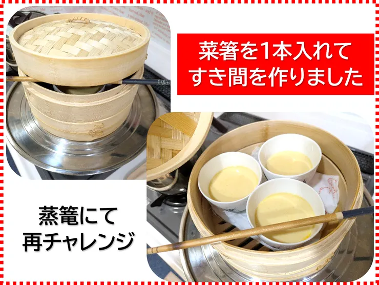 更にネットで調べると、蒸篭の蓋に菜箸を1本入れると良いとの情報をえたので実践してみました。