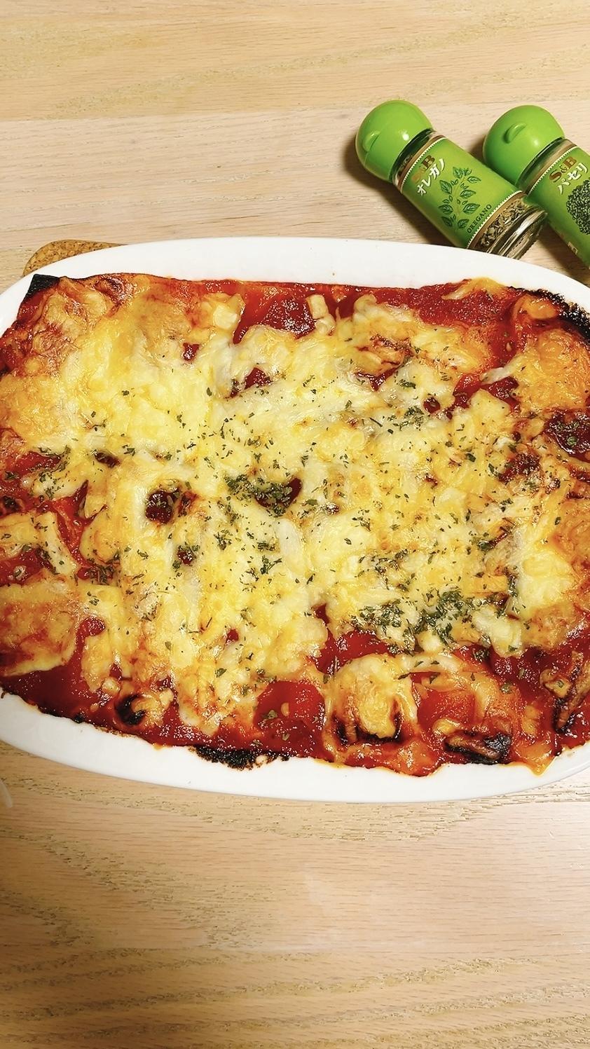茹でなくて良いラザニアだったのですが、オレガノをふったトマトの水煮に浸して柔らかくしてから、市販のソースを塗って、チーズとパセリをふって、焼きました。