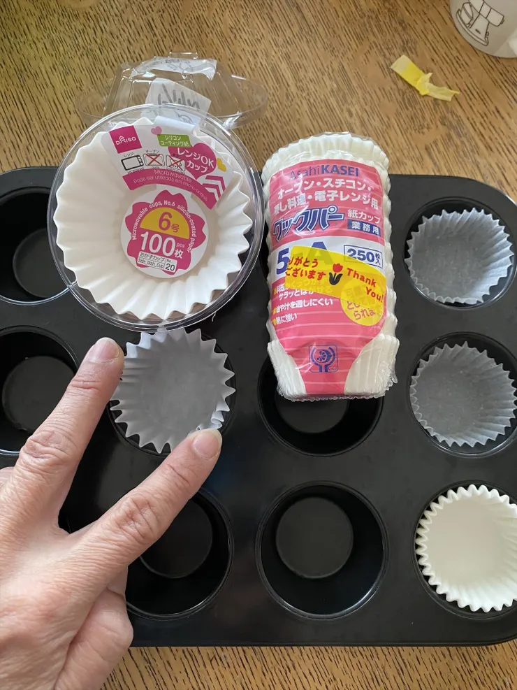 このミニマフィンの型にはずっとダイソーの紙を使ってましたが変なウェーブのために生地の上がりが良くないのが気になってた。あと、この6号ってのが1番小さいもので、ボヨンと上がってて生地を入れればストンと落ちるんだけど…少々使いにくい。