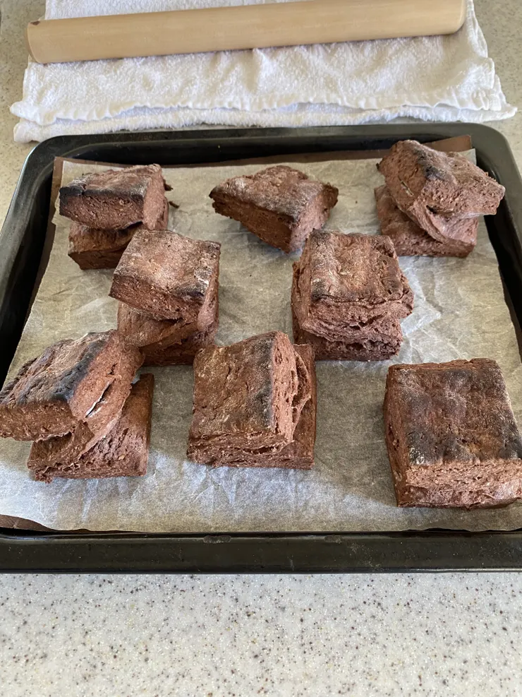 チョコスコーン、本当は生地を冷やしてから打ち粉をしつつ切っては重ねてを数回繰り返して層にするんだけど、冷やし時間がなかったのですぐに焼いてた。