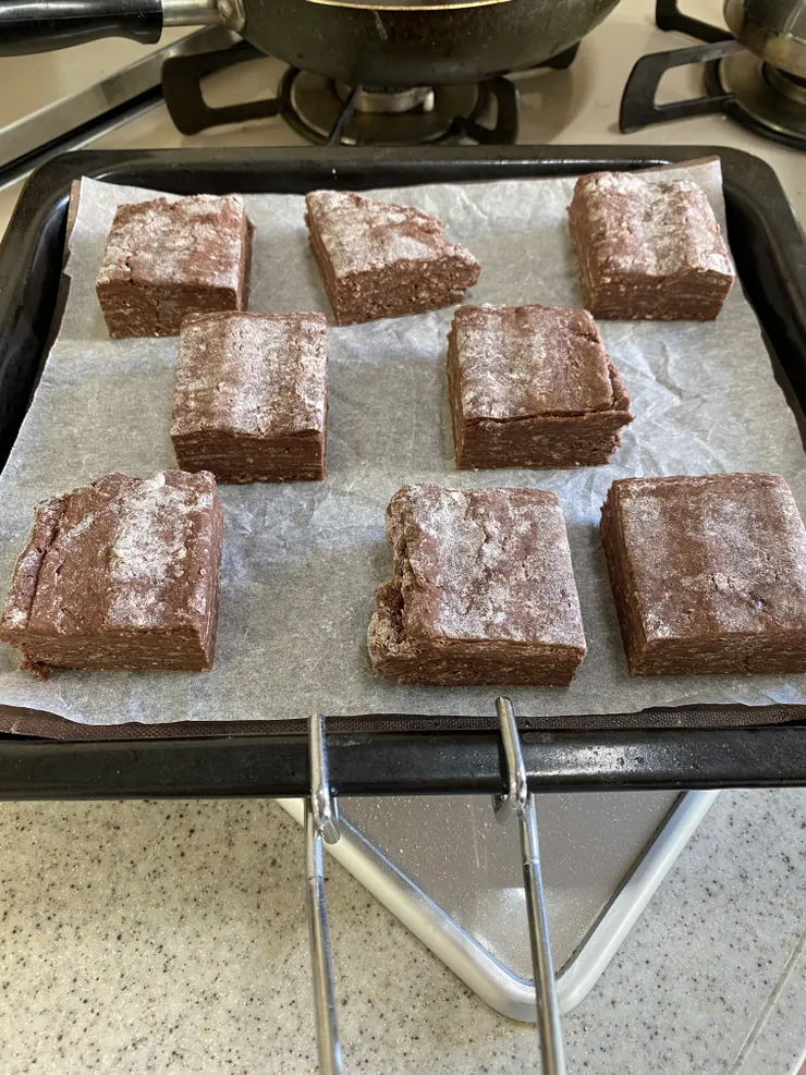 コンパウンドチョコの油分が生地に染み込んでおいしくなるんだなぁという発見もありました。(コンパウンドチョコがメダル状で大きいので刻まないといけなくて面倒だったのさ)