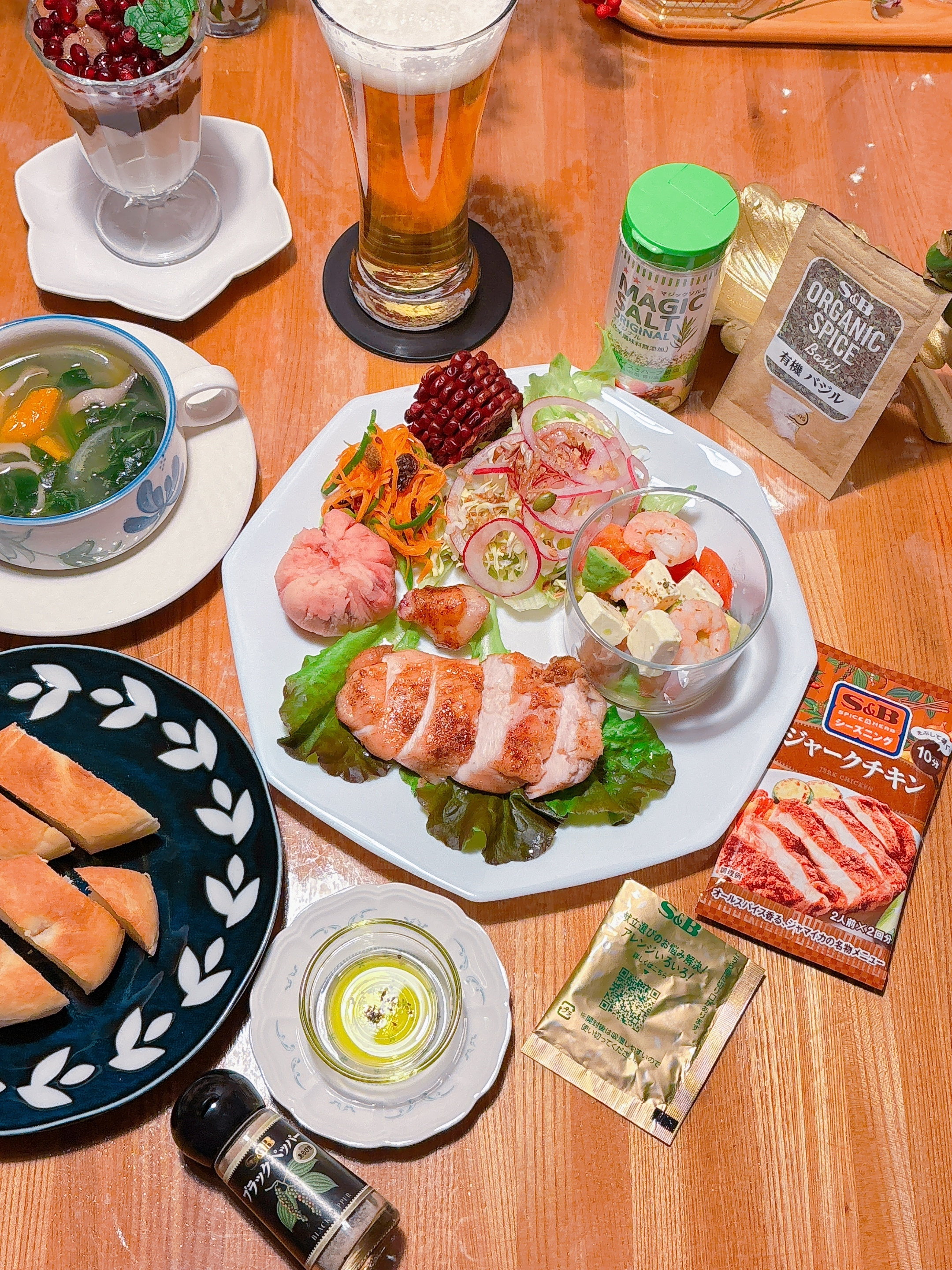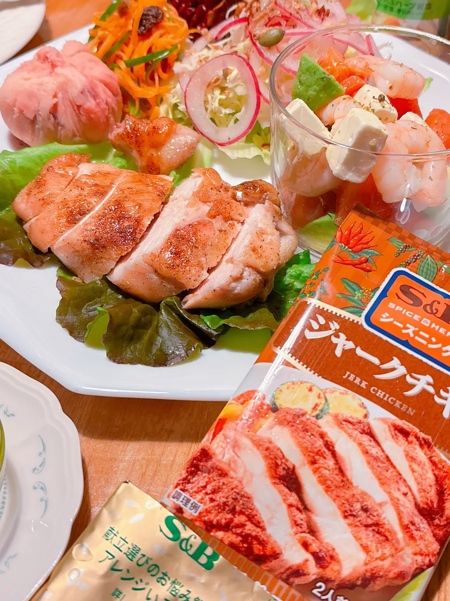 トップ > フォトレポート > スパイス&ハーブ > 🟢エスビーシーズニング🔴【ジャークチキン】 えすた💫 2026/01/25 22:56 🟢エスビーシーズニング🔴【ジャークチキン】 自力で解体した丸鶏のむね肉部分を使って、 大好きジャークチキン🐔シーズニングをまぶして焼くだけ・:*+.\(( °ω° ))/.:+ 最高に美味しいです オリーブオイルには「ブラックペッパー」海老とアボカドのマリネには、「バジル」と「マジックソルト」を使って簡単に味付け えすた ジャークチキン エスビーシーズニング ブラックペッパー バジルマジックソルト いいね 共有する 共有する X facebook LINE リンクをコピー コメントする 2 件の返信 (新着順) ミュートしたユーザーの投稿です。 投稿を表示 みきママ 2026/01/26 16:09 盛り付けも豪華で美味しそうですね いいね 返信する ミュートしたユーザーの投稿です。 投稿を表示 SPICE&HERB COMMUNITY事務局 2026/01/26 11:37 えすたさん、こんにちは! ご自身でご解体されているんですか👀✨ ひと手間も合って、より美味しく頂けそうです♪ いいね 返信する