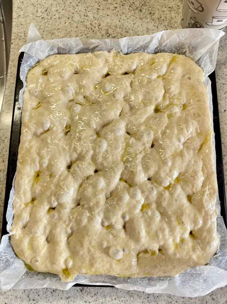 昨日のフォカッチャを人にあげてしまったのでまたさっき焼いた。穴を開けてオリーブオイルを塗るのに最終発酵後の方がいいのかな?と(よくあるレシピサイトだとそうなってる)そうやってみた。