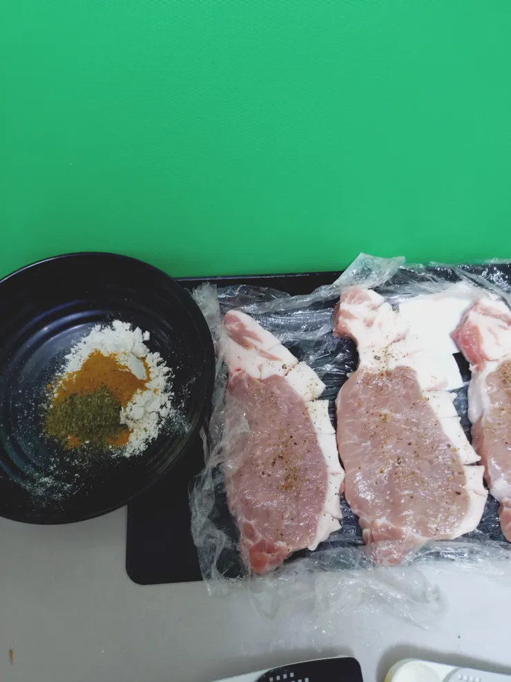 豚ロース肉をカレー粉を付けてとんかつにしました〜♪