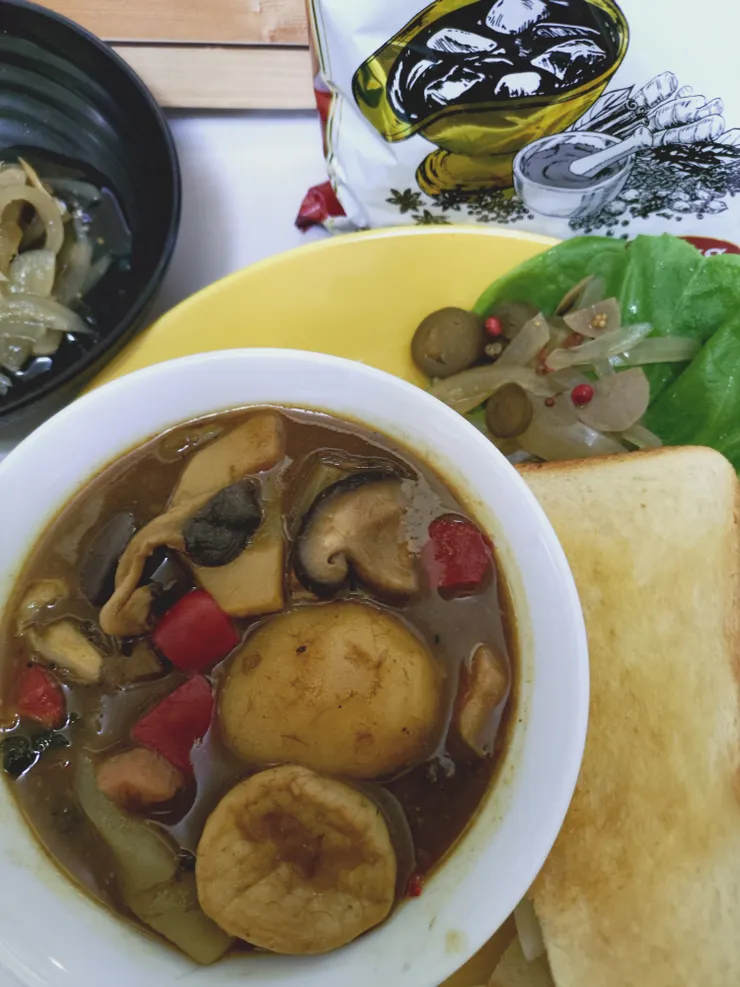 💠茸たっぷりと厚揚げ、筍、手綱こんにゃく、小松菜のカレー🍛