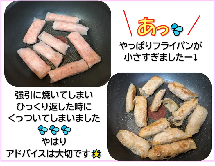 フライパンが小さすぎて、ソーセージ同士がひっくり返す際にくっついてしまいました⤵