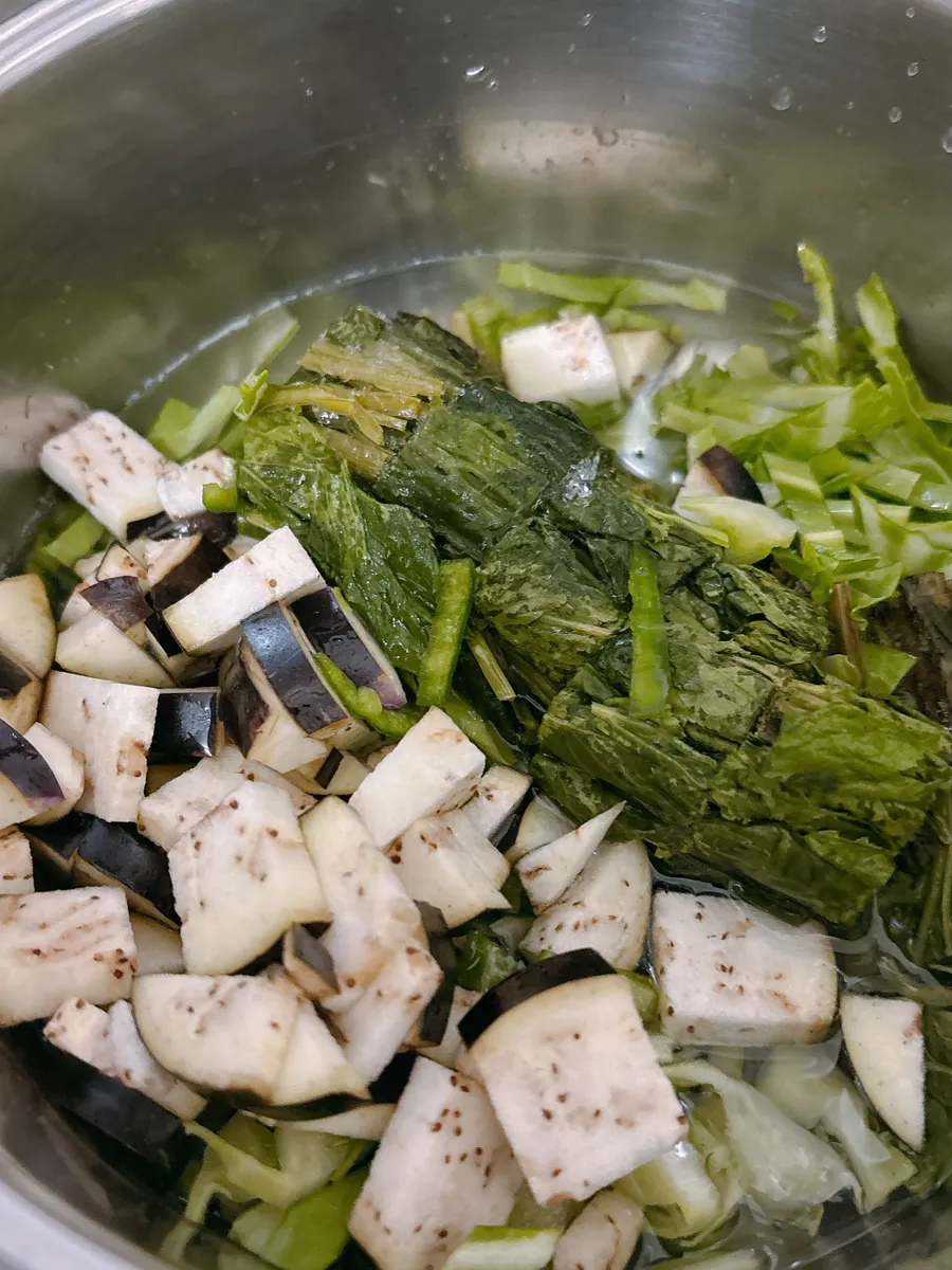 「赤缶カレー」とトマトがなかったので、「こくトマライスソース」を使ってみたらどうだろう?と思い、冷凍庫に眠っていたセリやピーマン、キャベツ、野菜庫で鮮度が落ちてしまった茄子をいれ、ブレンダーで滑らかに。