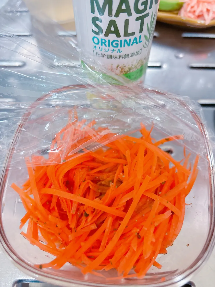![]() にんじんに、「マジックソルト」を振りかけて、しんなり。 お酢やマヨネーズなどですぐアレンジ可能🉑 |