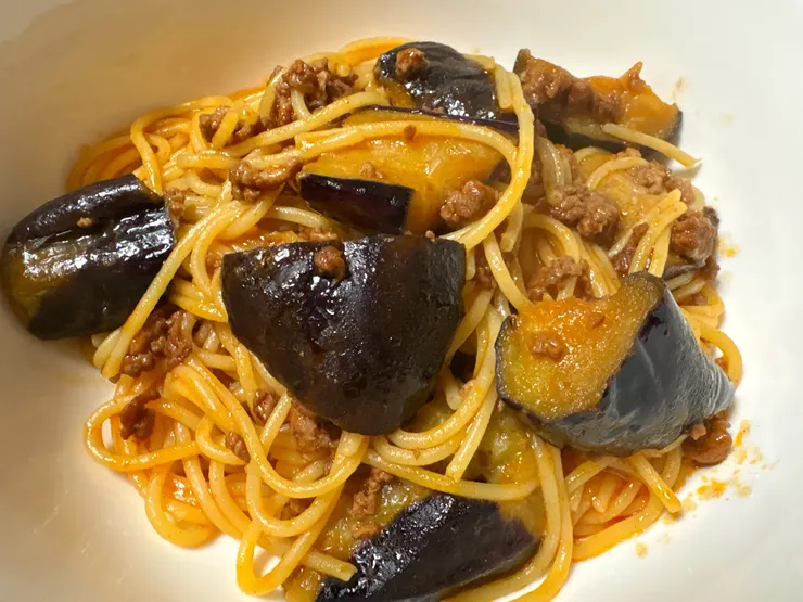 冷凍合挽肉と冷凍揚げなすを使い、ボロネーゼソースを作り、クミンとを入れたスパイシーなパスタです。カレーの様な風味がとても食欲をそそります!