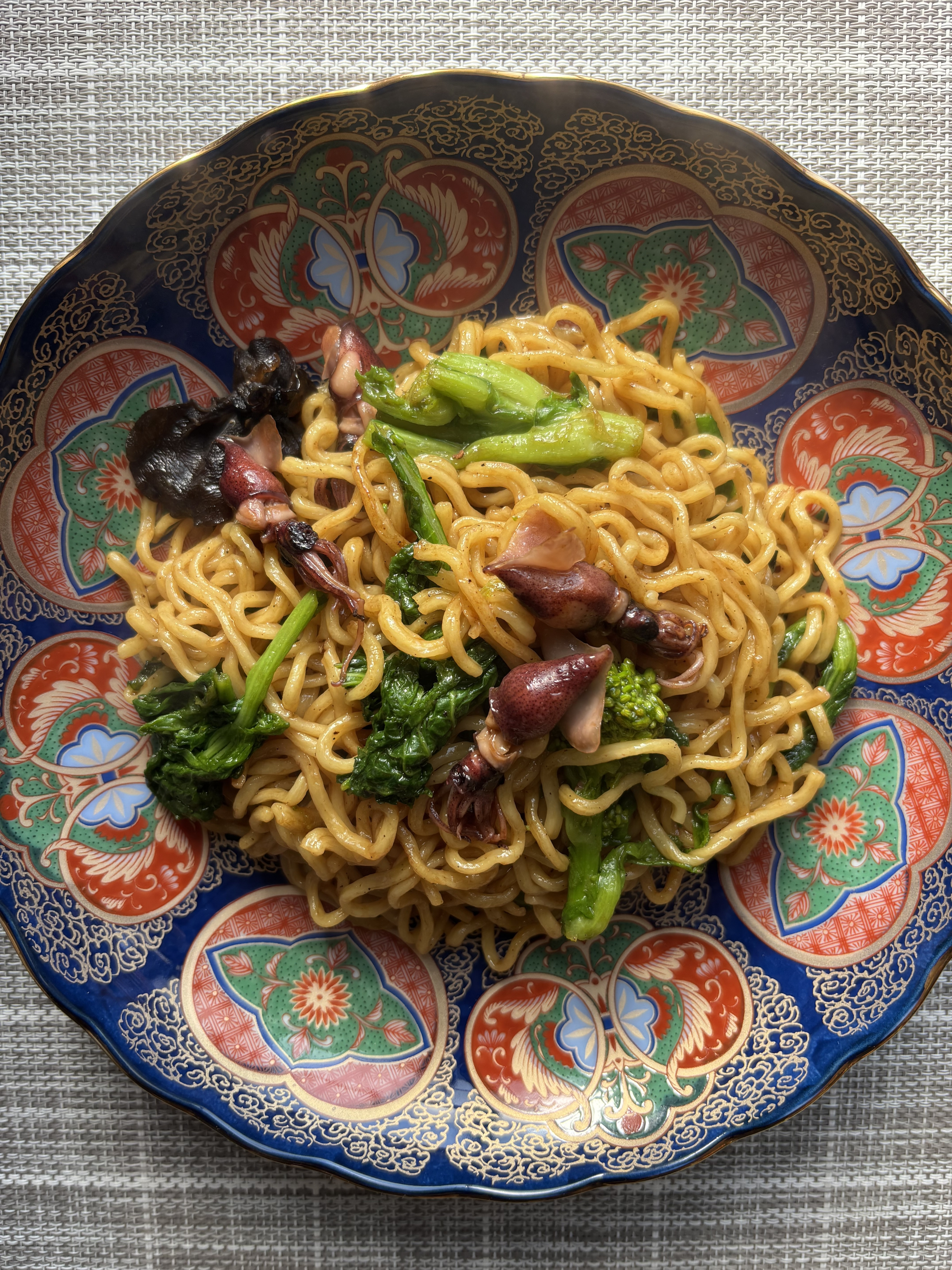トップ > フォトレポート > ちょい足しアレンジ > 菜の花とホタルイカの上海焼きそば tochi 2026/01/14 06:35 菜の花とホタルイカの上海焼きそば 中華麺80g、菜の花適量、ホタルイカ適量、塩胡椒適量、オイスターソース適量、紹興酒適量、キクラゲ適量キクラゲを水でもどしておく。茹でたホタルイカの目を取り除く。菜の花を下茹でする。フライパンに油を入れて麺を入れたら焼いて、ほぐしながら紹興酒、塩胡椒、オイスターソースを加えたら菜の花、ホタルイカ、キクラゲを混ぜ合わせながら炒めて完成。オイスターソースに紹興酒の香りもプラスした菜の花とホタルイカの上海焼きそば。 いいね 共有する 共有する X facebook LINE リンクをコピー コメントする 0 件の返信 (新着順)