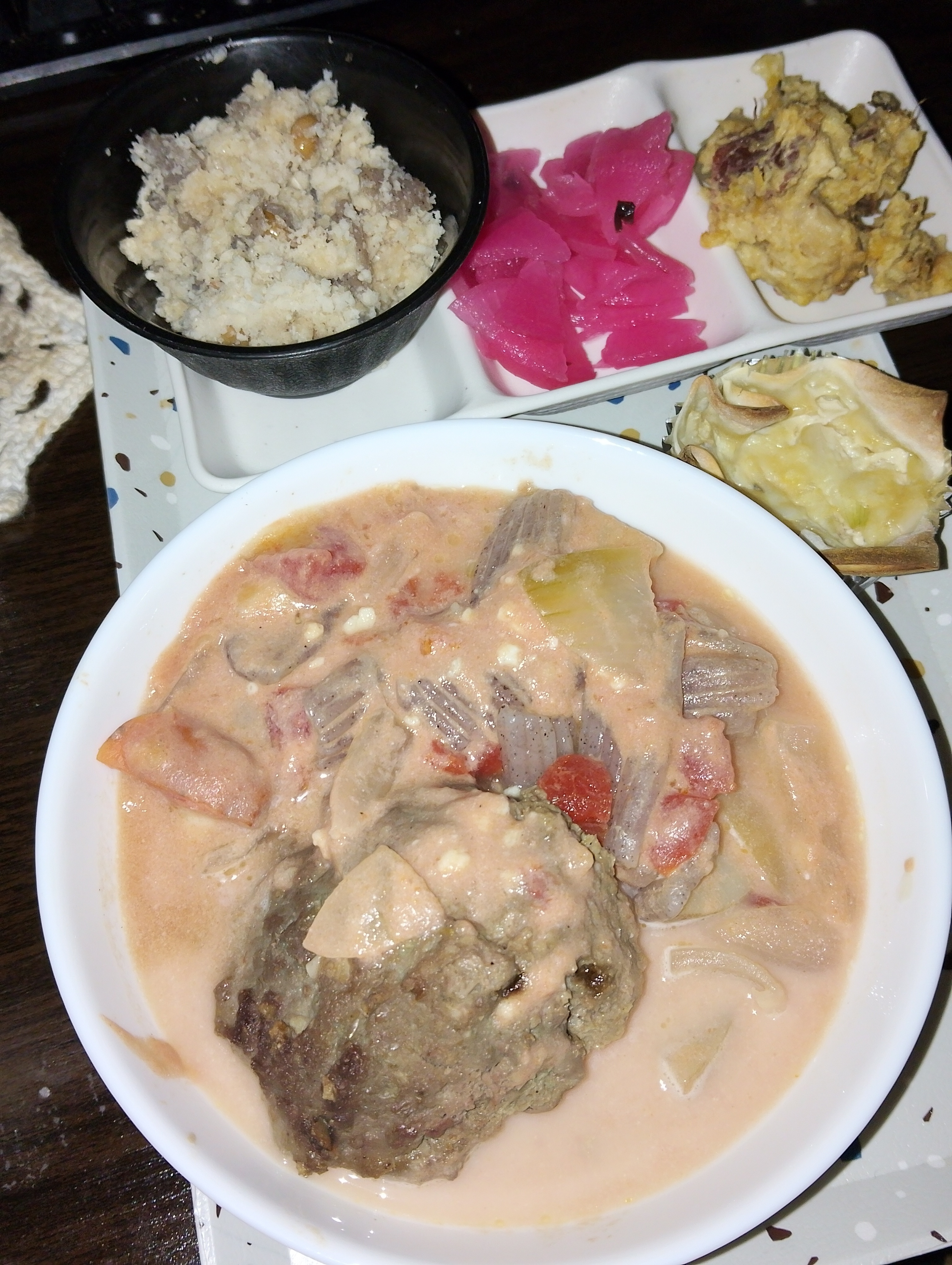 シュクメルリの濃厚な味わいとおからバーグの組み合わせ、面白いです👀✨