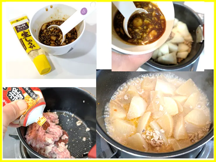 大根の挽肉煮は、味噌・醤油・酒・みりん・豆板醤・生姜で味付けしました。