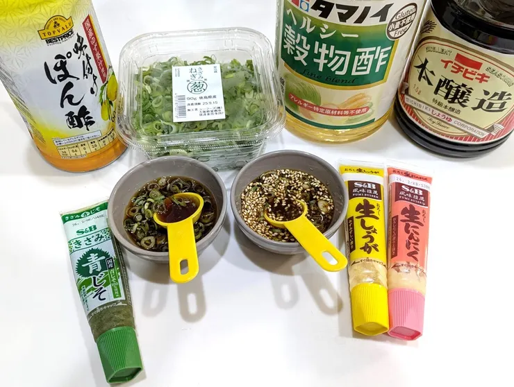 酢を小さじ2 砂糖小さじ1 刻みネギと白ごまはお好みでかけます。