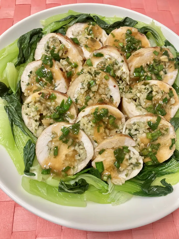 鶏むね肉を観音開きにして五香粉入りの餃子のタネを巻き、ラップで包んで湯煎して鶏ハムに