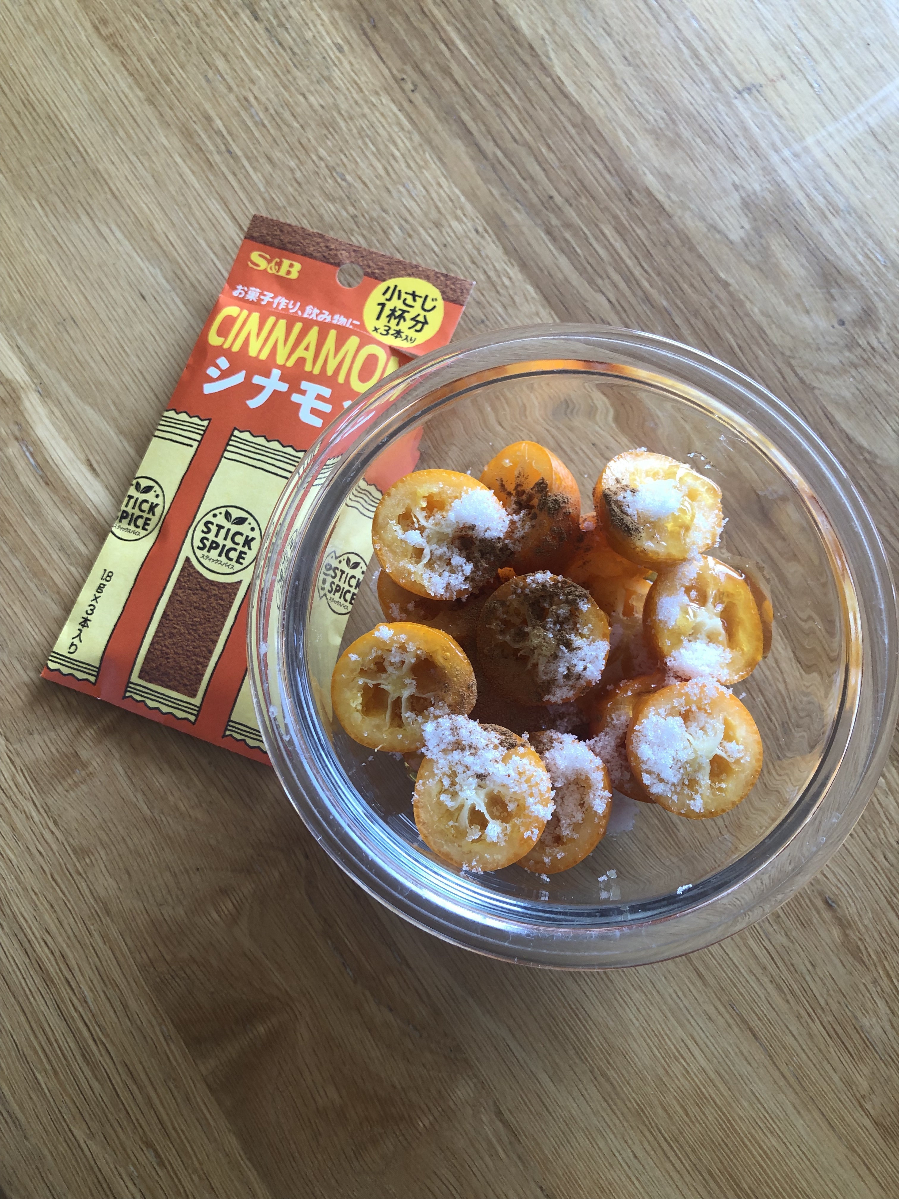 耐熱容器にきんかんと砂糖とはちみつとレモン汁とシナモンスティック1/2を入れてラップをしてレンジ4分で完成