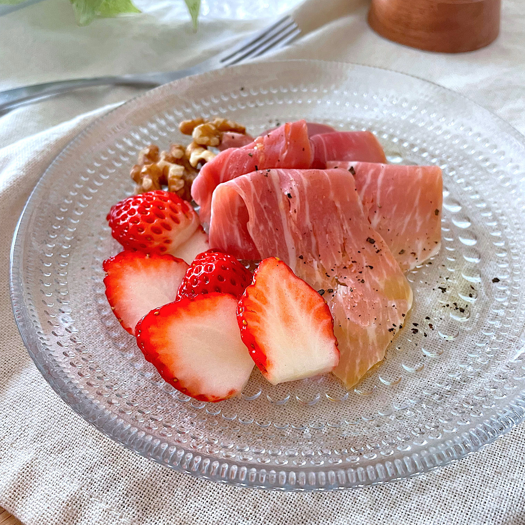 投稿を表示おしゃれで高級感ありすね。真っ赤なイチゴにピンクの生ハム、おしゃれ💛
