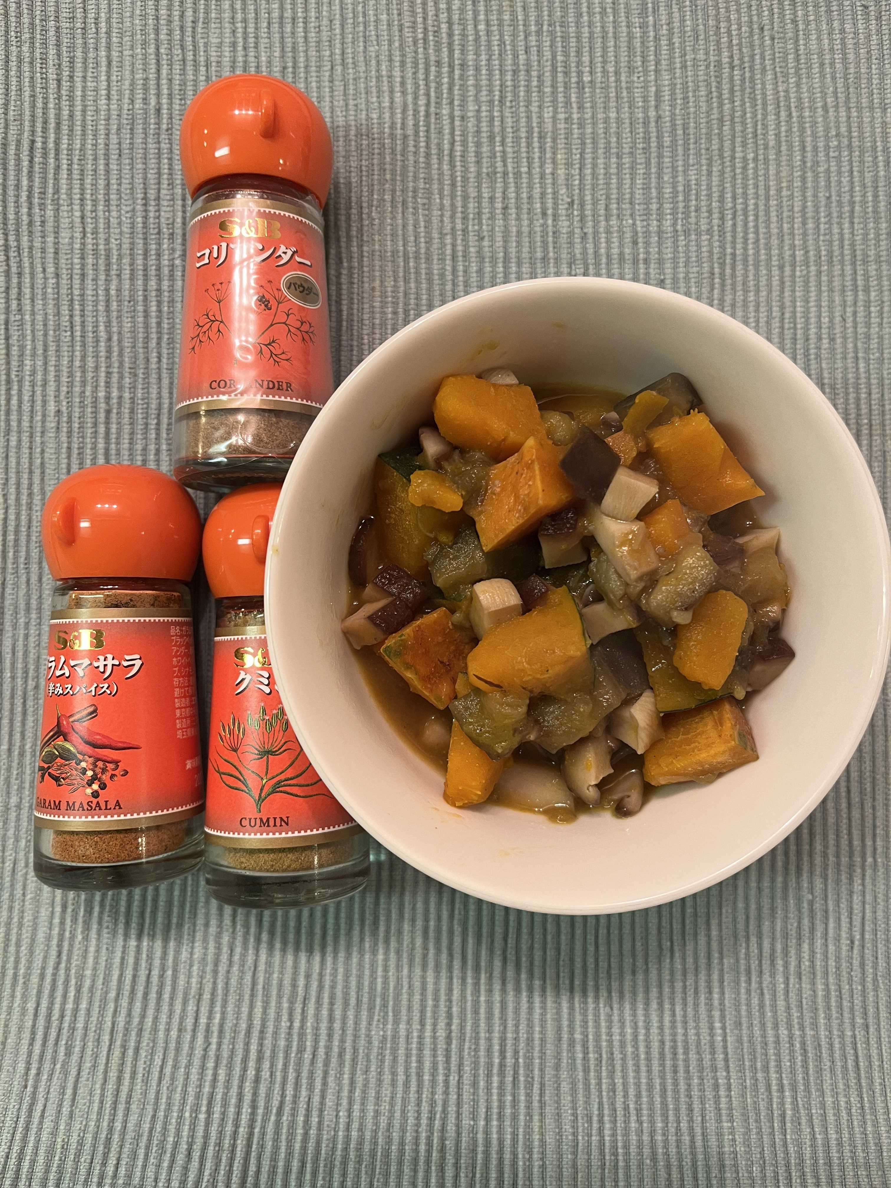 なす、しいたけ、かぼちゃ、クミン、コリアンダー、塩でサブジを作りました。仕上げに醤油を数滴、ガラムマサラを2振り。