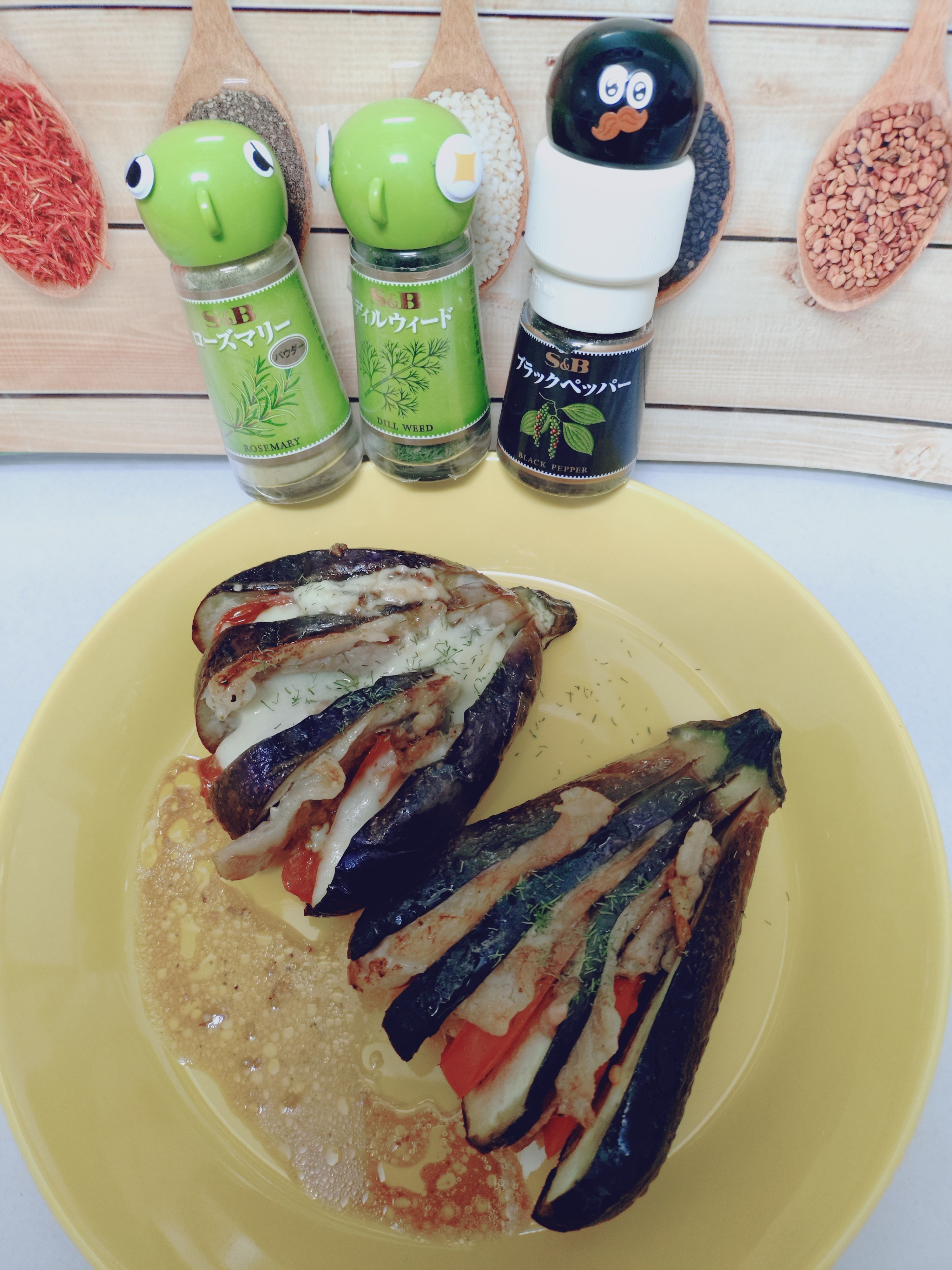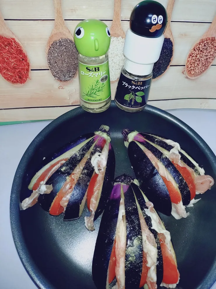 今回のお料理も茄子をああいった感じににカットして、具材を挟み込む→斬新です!