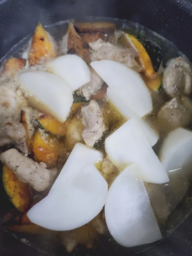 蕪、かぼちゃ、さつまいも、チョップドオニオン(水で戻す)を使いました。
