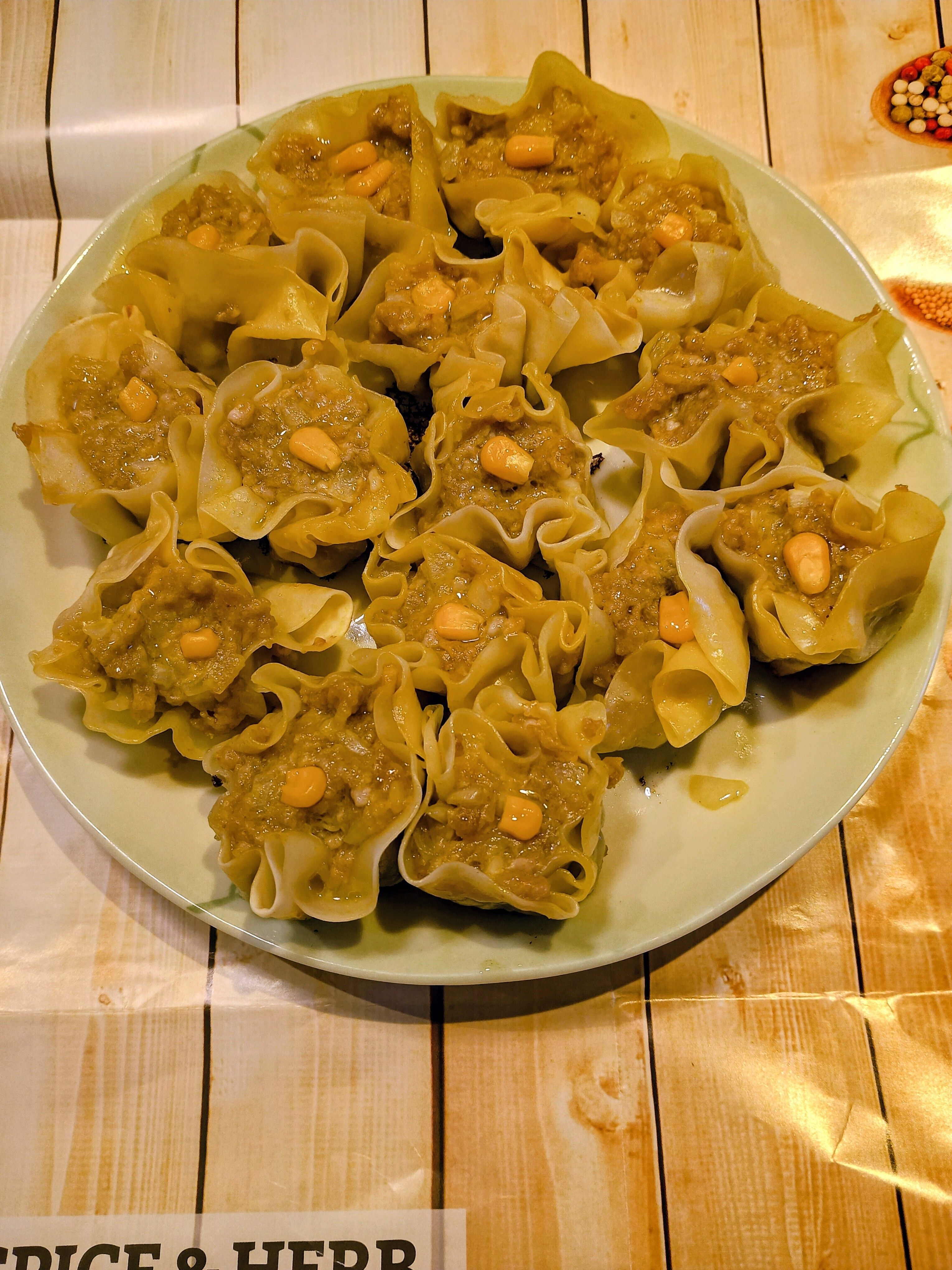 しゅうまいのタネにカレー粉を入れて飾りもコーン、と黄色🟡でまとめたんですね、美味しそう😋